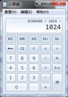 6.这时会打开Windows的计算器窗口,在这里输入8388608/1024/1024