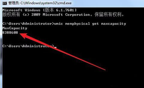 4.按下回车键后,就可以查看到当前主板支持的最大内存数了,比如笔者的电脑为8388608,这个是字节数,如果要换算成GB的话,还需要进一步的运算。