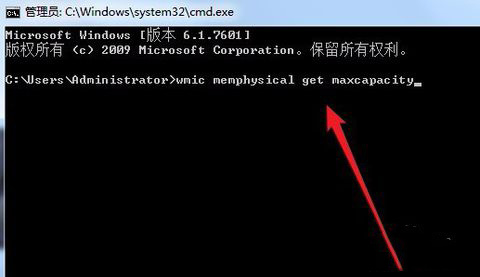 3.在接下来打开的命令提示符窗口中,输入命令wmic memphysical get maxcapacity